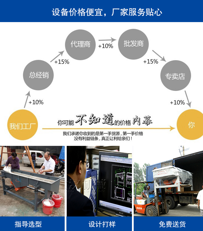 我們廠家在石英砂篩分機報價上是公正合理的,因為大漢屬于直銷型企業(yè),設(shè)備是直接銷售給用戶的,不會存在中間商,可以節(jié)省中間銷售環(huán)節(jié)的額外費用,石英砂篩分機價格更便宜。