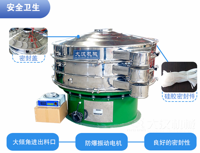 為了保證原材料的衛生情況,維生素粉超聲波振動篩要具有良好的密封性,密封件全部采用食品硅膠,網架采用潔凈型粘接網架。減震彈簧部分由不銹鋼圍裙包裹;振動電機可定制為更為安全的防爆振動電機,確保生產安全。考慮到消毒清洗的性和簡便性,超聲波振動篩的出料口、進料口設計需要采用大傾角設計,更利于清洗和消毒。