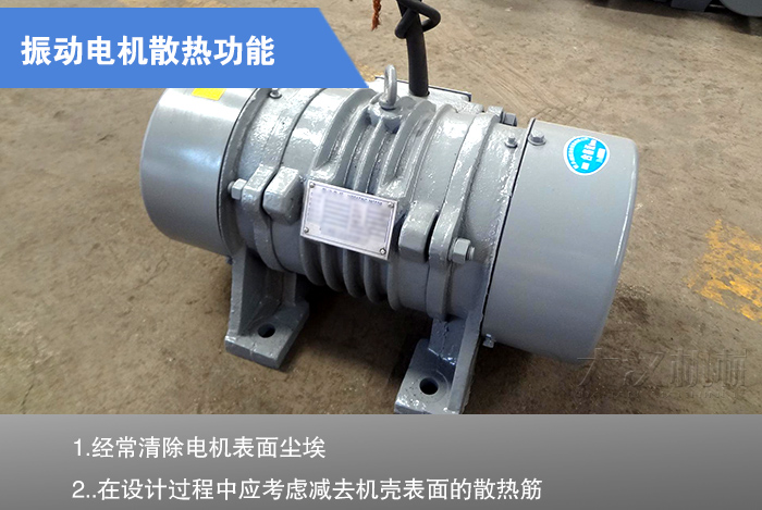 普通電機(jī)--端有風(fēng)扇,工作時(shí)使風(fēng)向順著機(jī)殼上面的立筋流動(dòng),不僅散熱較快,而且也清除了上面的塵埃,使電機(jī)在良好的狀態(tài)下工作。而振動(dòng)電機(jī)因無(wú)風(fēng)扇可散熱,全靠自然冷卻,再加上工作環(huán)境大都非常惡劣,粉塵大,粉塵極易在電機(jī)表面堆積,從而引起內(nèi)部溫度過(guò)高,燒毀電機(jī)。