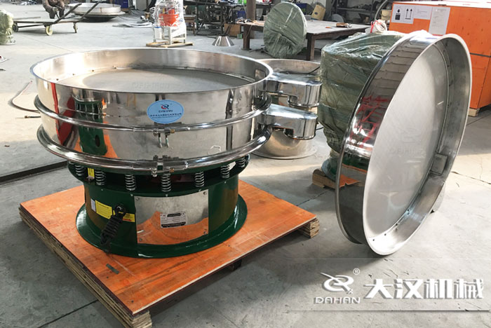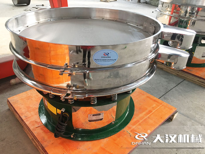 DH-1000-1S型振動篩分機為1500mm直徑單層兩出口不銹鋼三次元振動篩,子母網分離式網架,與物料接觸半部為304不銹鋼材質,底座為碳鋼材質。